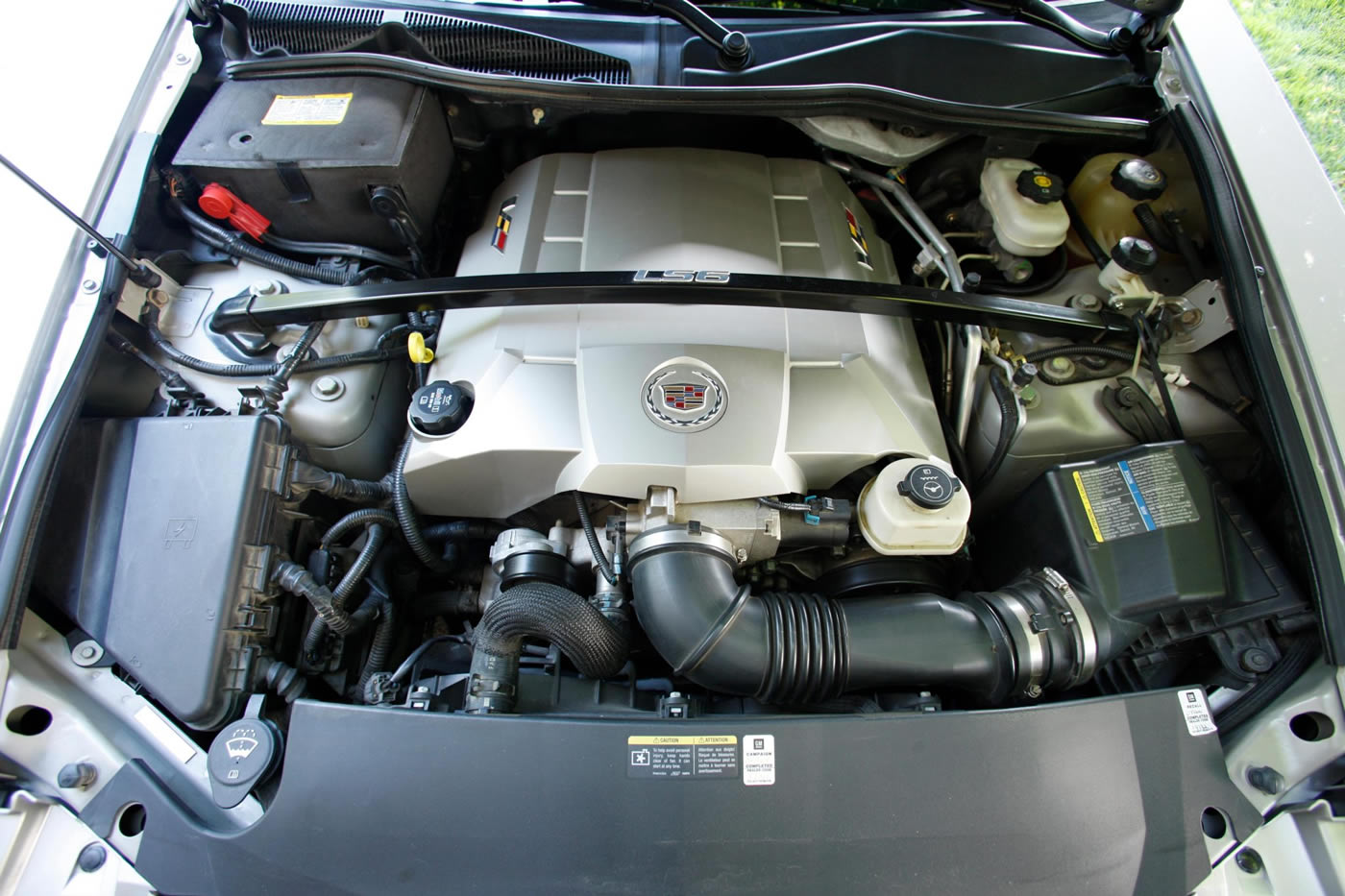 This 2004 Cadillac CTS-V is powered by a 5.7-liter LS6 V8 mated to a six-speed manual transmission. It is finished in Light Platinum over Ebony leather upholstery. The 5.7-liter LS6 V8 features an aluminum block and cylinder heads, a billet steel camshaft, and sequential-port fuel injection. Factory-rated output was 400 horsepower and 395 lb-ft of torque when new.