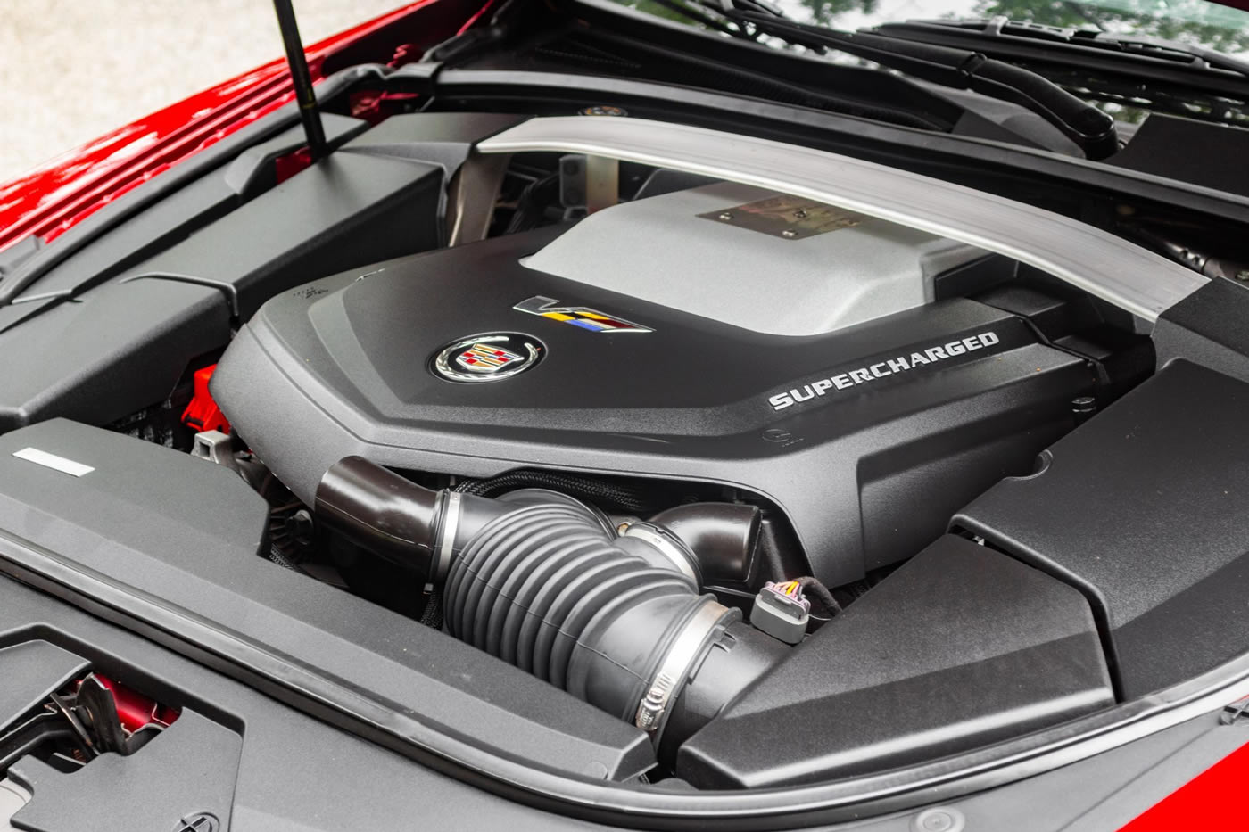 This 2009 Cadillac CTS-V sedan is finished in Crystal Red Premium Paint over Ebony/Cashmere leather. The car is powered by a supercharged 6.2-liter LSA V8 rated at 556 horsepower and 551 lb-ft of torque paired with a six-speed manual transmission.