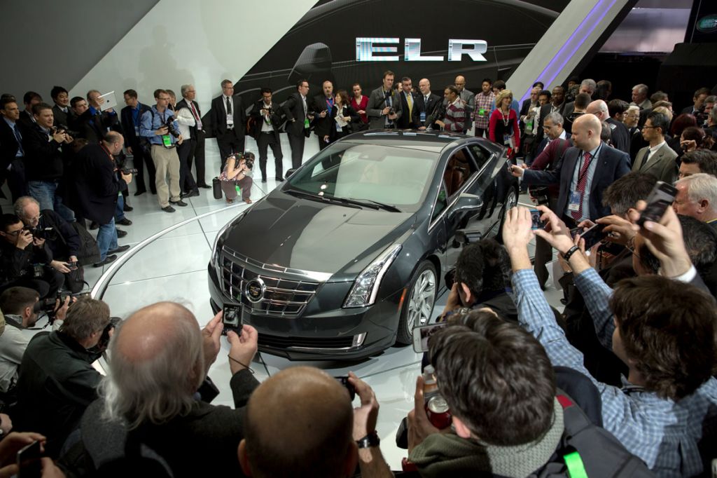 Media surround the 2014 Cadillac ELR, with Extended Range Electric Vehicle technology, after its world debut Tuesday, January 15, 2013 at the North American International Auto Show in Detroit, Michigan. The ELR features full driving range exceeding 300 miles (480 km), combining pure electric driving and an efficient, range-extending generator. ELR production begins in late 2013 with sales starting in early 2014. (Photo by John F. Martin for Cadillac)