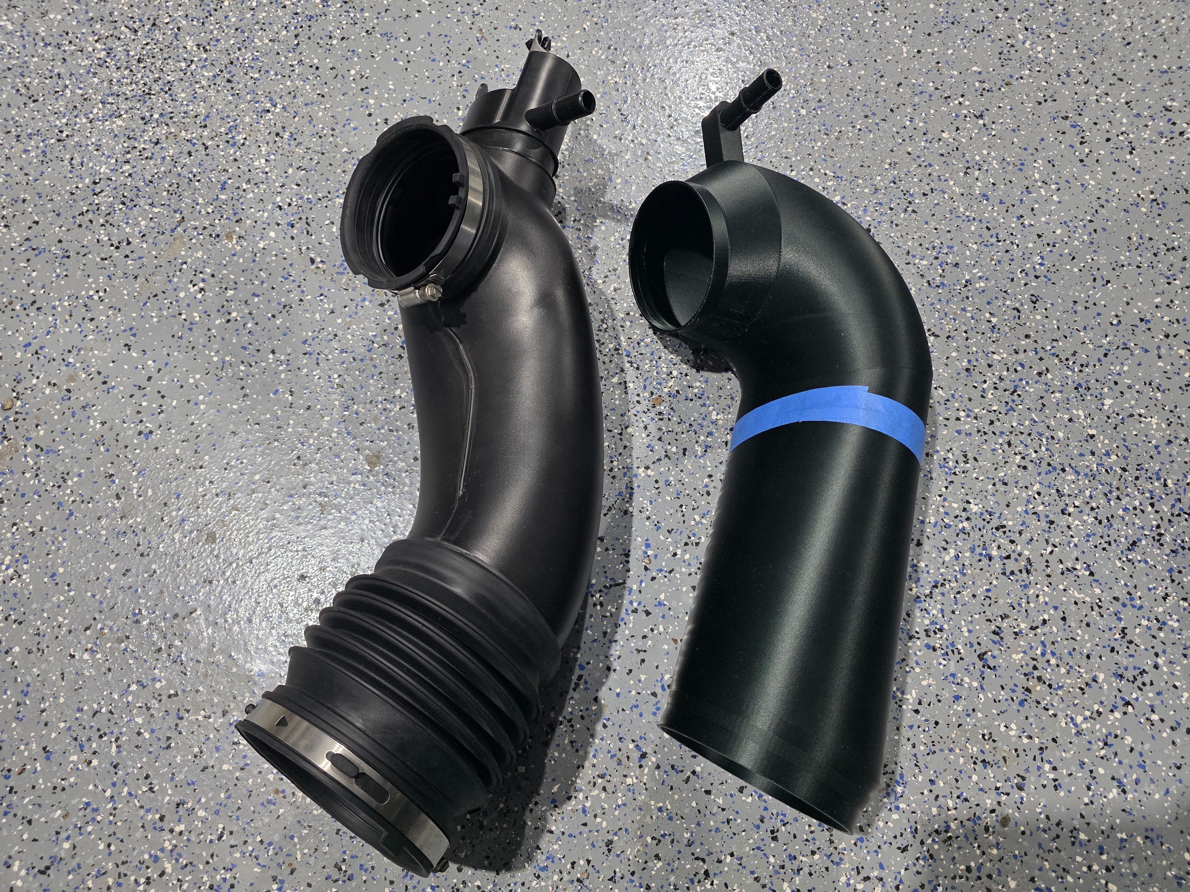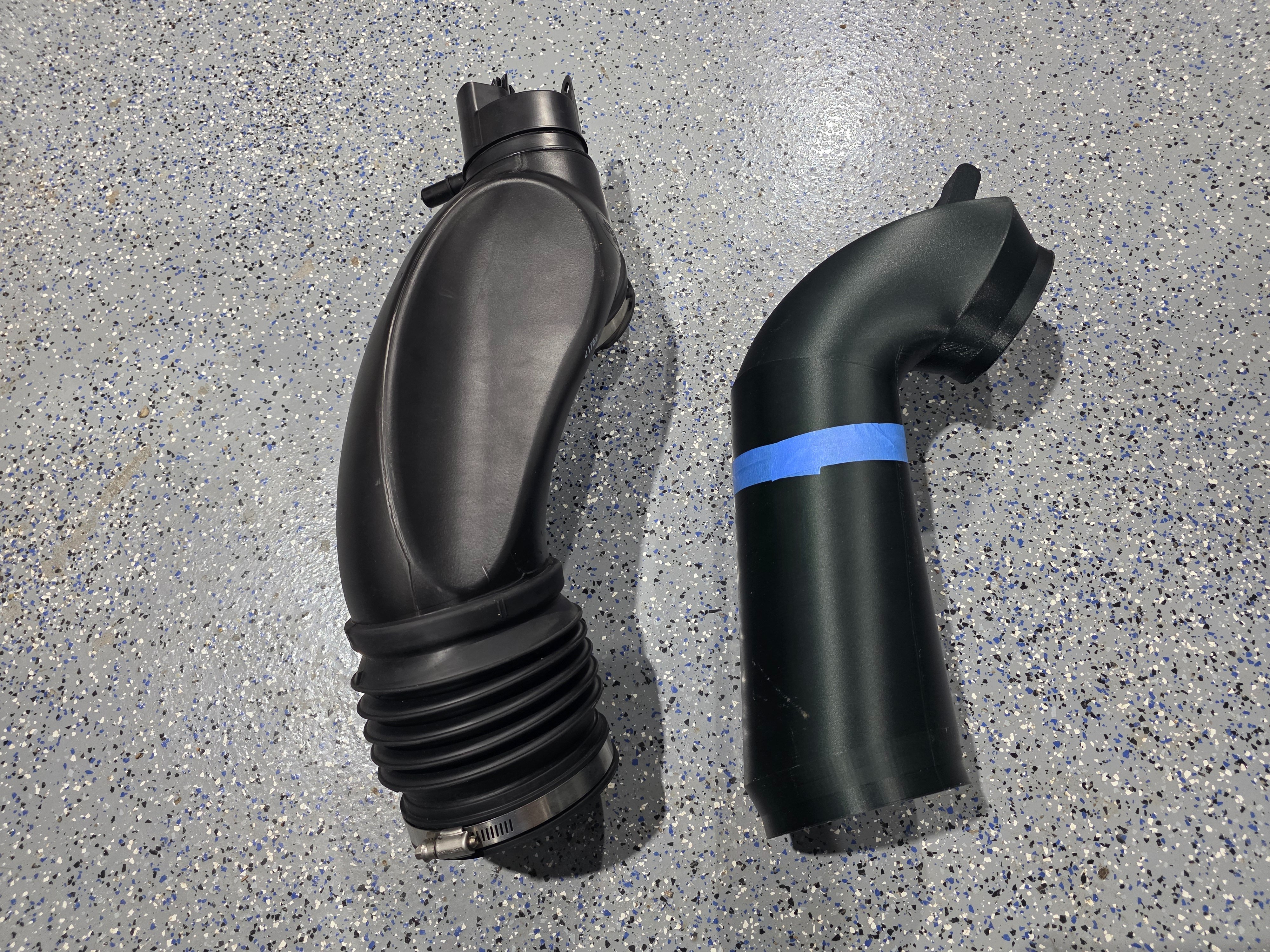 Edit- The prototype with the tape was very rough, the final design is longer to get closer to the filter box and the elbow going into the throttle body was made bigger and way smoother of a transition compared to the prototype so dont let that sharp 90 fool you in the pictures its nowhere near as bad as it looks.