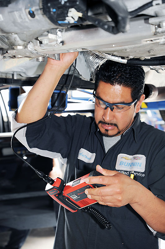 After 4000 miles of oil consumption tests, next, TAC instructed Bunnin Cadillac to pull the spark plugs for inspection–no easy task on an LF4. Getting them out requires removal of most of the turbocharger compressor plumbing. A couple plugs showed some evidence of oil use, so TAC, next, ordered Tony Espinoza, Bunnin's Lead Service Technician, to borescope the engine.