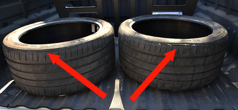 Ninety bucks lighter after the tow, I get the car up in the air on jackstands and pull off the left-front. That bitch is toasted–corded in several places on the inside edge of the tread, the casing is holed, but there is plenty of tread depth left. So I stick my head under the right side and, s**t, that tire is almost as bad! I got the two used spare fronts I have off my garage tire rack, take the two tore-up tires off my ATS-V and throw all that in the back of our Colorado ZR2. I head for Woolever's Tire Service on the other side of town.