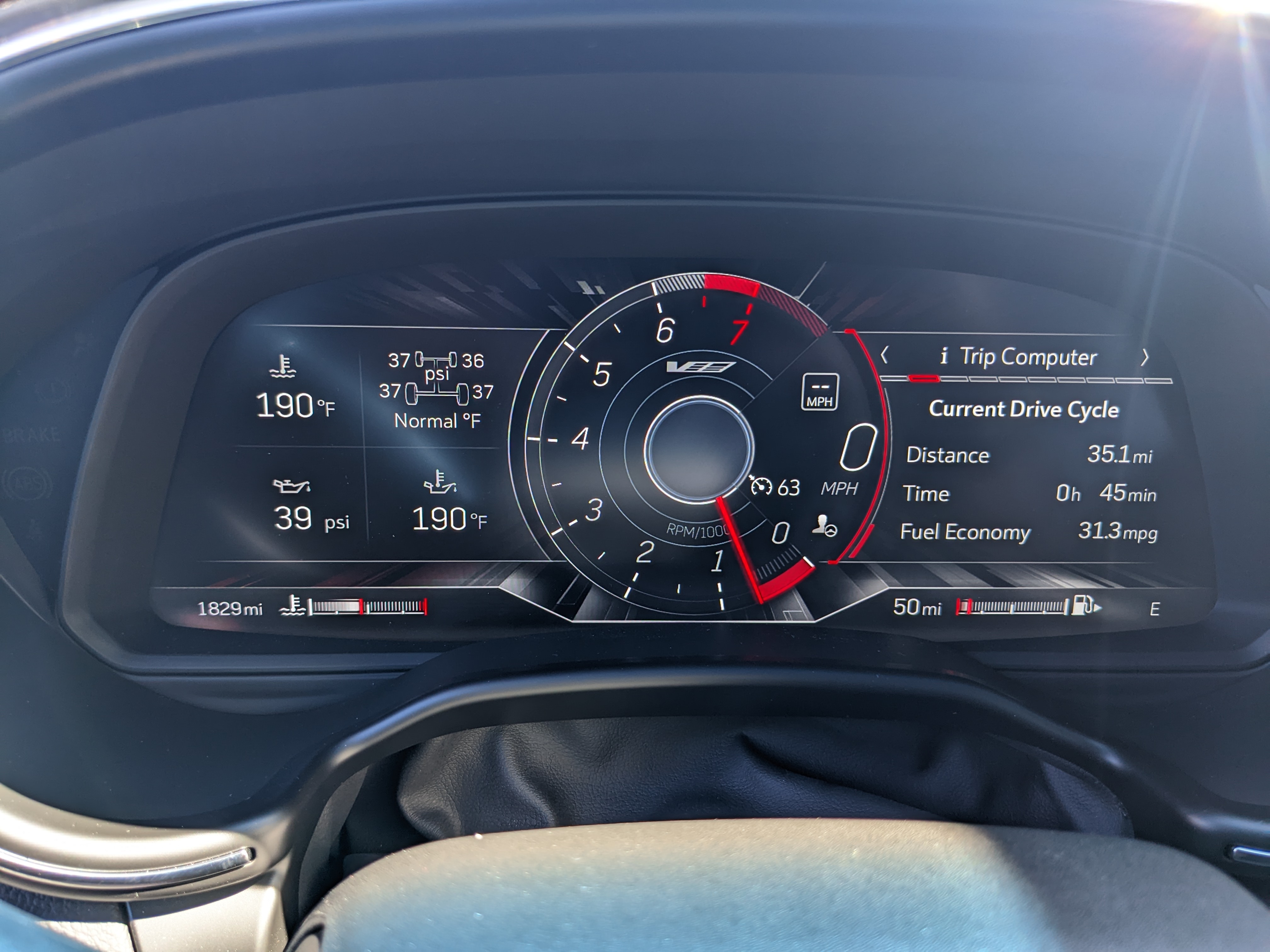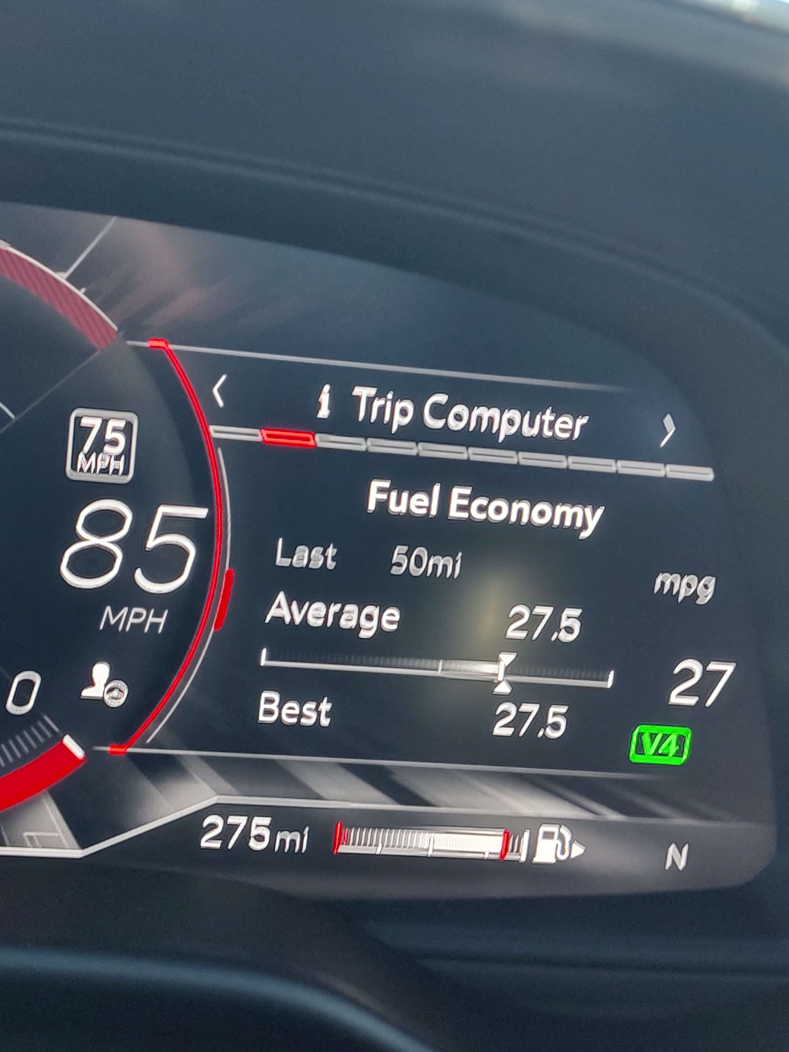 Here's mine from the other day. Note the speed. That's on level pavement, no cruise, not coasting. Think it's pretty impressive for a V8 at 85 mph. According to the App, my trip was 144 miles, 2 hard braking, 8 hard accelerations, 27% over 80 mph, and I averaged 24 mpg. I'll take that all day.