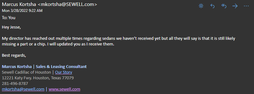 I am in the same boat but am sooooo happy having moved out of 1100 Goat Purgatory that I don't really care. To me, it just means that I will get a car this year! It is a tough time for manufacturers and no one at Cadillac can be happy about all of this.