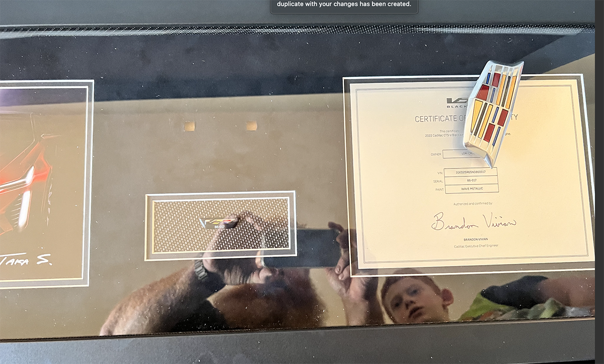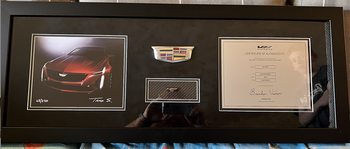 I got mine yesterday... It came in with the cadillac symbol fallen off and sitting above the certificate. I had to pull the nice backing paper off to get to the backer board to fix it, but it is a nice touch and we are super happy to have it. It would happen to me thought woudn't it?? #forevertheredheadedstepchildView attachment 5708