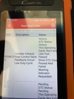 Put the BW in service mode (e.g. hold start button for about 8 seconds or so, feet off the pedal), I'd start by doing a live data review, with the Creader, go to ECM > Data Stream and scroll till you find Variable Exhaust Flow Control Valve Command & Variable Exhaust Flow Control Valve Command 2, there should be a % value to the right. Both of these values should be similar to each other (~ +/- 1%). (based on my observations)