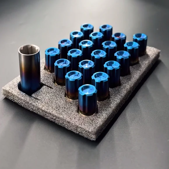 Was thinking titanium lug nuts would compliment the ceramic brakes. Since the car is black and blue, how about going with burnt titanium from Atomic Wheels. How’s it look? I’m thinking dust over time will mellow the brightness down a little too View attachment 33449