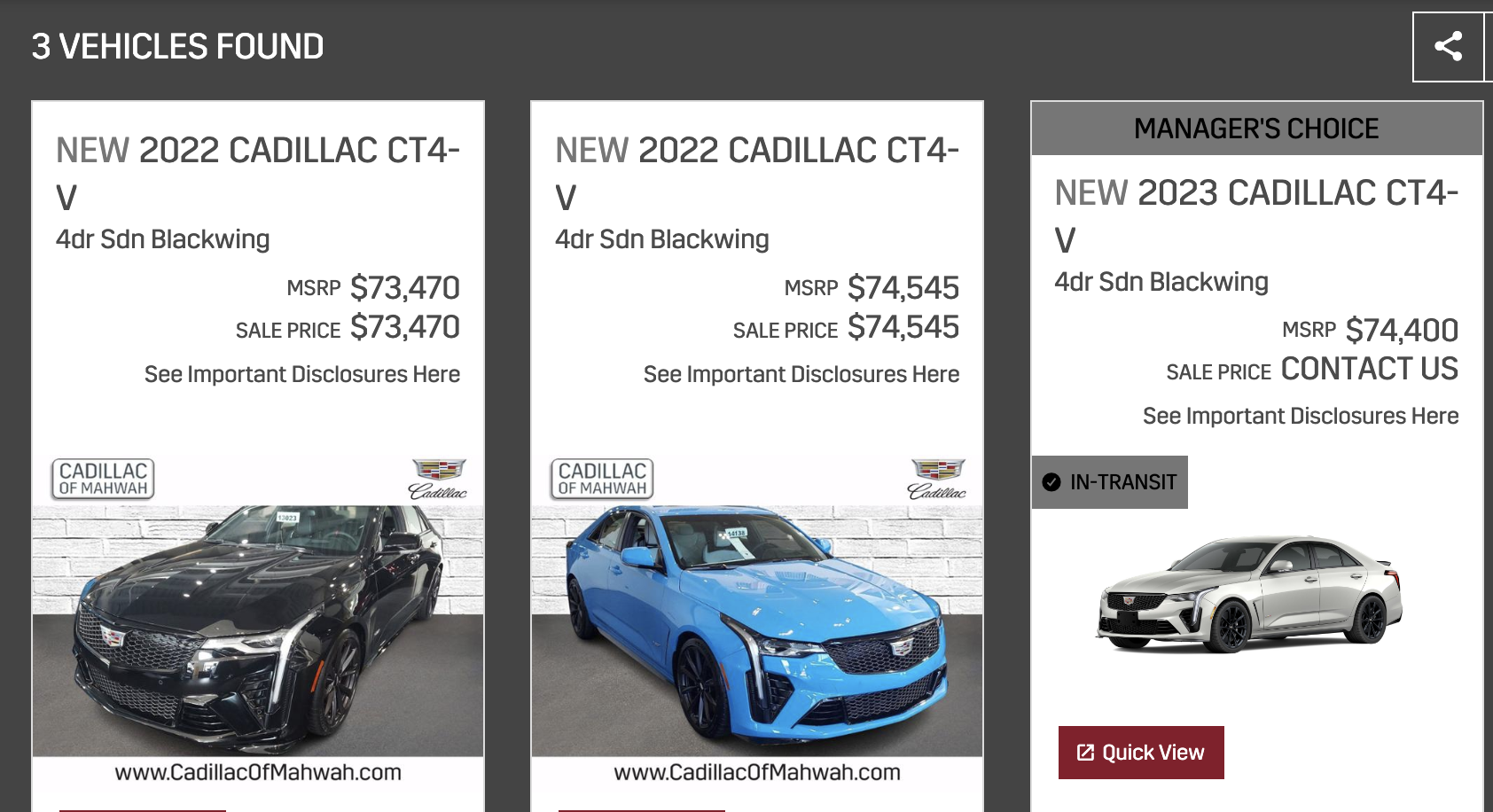 This is what I see on their website. IMO, when they start loading these cars up with $14k in options and they start to get a bit too expensive for what they are. They spec these cars with $1,600 PDR and $725 HUD which is desirable for the track but then they also add $1,050 for sunroof, which is not desirable for track work. Furthermore, they are 2022s while 2023s are starting to show up, all while we head into winter. These same cars for 2023 also get also get a $1,500 price increase so we are talking about $75k+ without any carbon fiber, which is now over $10k for 2023 for the full package. It is getting out of hand. IMO, $60-$70k is the sweet spot for these cars. If I wanted an automatic I would probably get a nicely optioned CT5V (non-BW) for like $60-$64k instead.