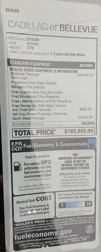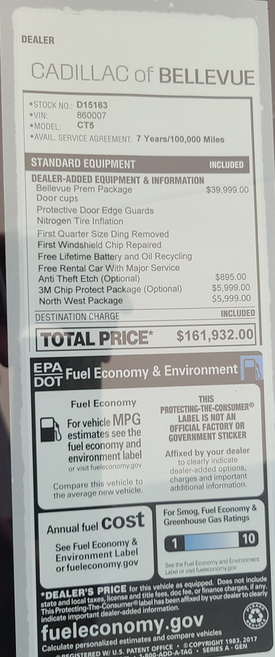 For 40k they will only repair 1 ding less than the size of a quarter? Talk about a deal breakerI can say that Cadillac of Bellevue (Washington State) is decidedly not doing MSRP. They do have two on the showroom floor, both black. One with everything - the "Anniversary Edition" they say, #1969. Above MSRP, they kindly add the "Bellevue Package - Nitrogen in tires, free oil recycling, single door ding, door edge guards, "Door cups" - for a cool $39,995. For your convenience, they also add Anti-theft etch for $895 and the "North West Package" (undefined) for $5,995. Total: $185,995. The second car has no carbon, MSRP of 109k. They've added their collective packages which brings the price up to 162k.