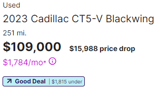 Strictly curious, does that amount to say 10k off of sticker? Not sure what invoice is compared to MSRP. At that #, I would consider adding a 4 just to have the pair.Purchased my 2023 CT4-V Blackwing (loaded minus exterior carbon packages) at Bergstrom Cadillac in Madison, WI on 8/7/23 at “invoice” plus the $4K GM rebate…thought it was a helluva deal for this current market.