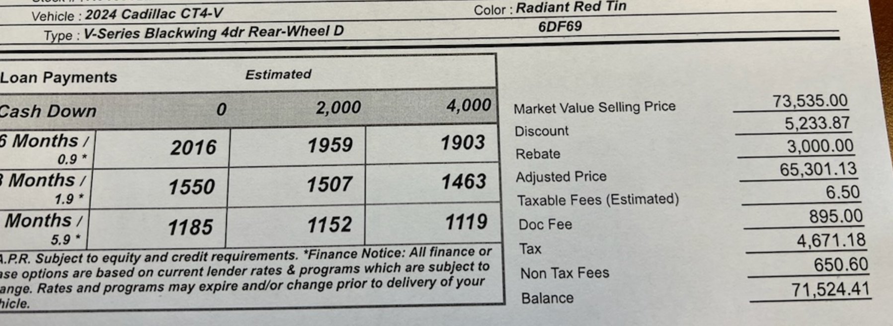 Have them drop or explain the "non tax fees".Does this seem like a good deal? I ordered the 6MT, RRT exterior, and the SCG seats. This one has the black vented seats instead and the PDR (not planning to track it). I had asked for $69K OTD.
