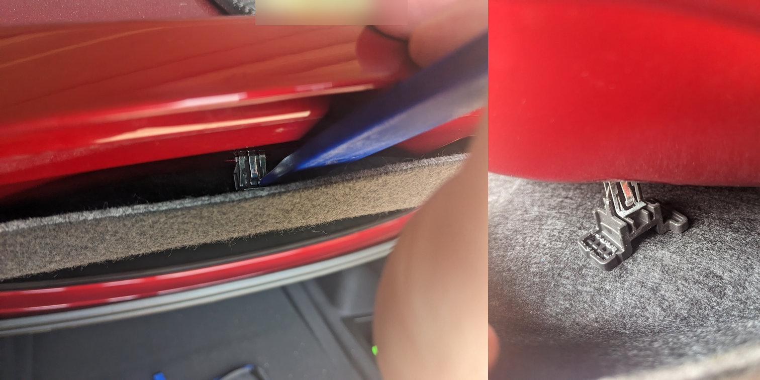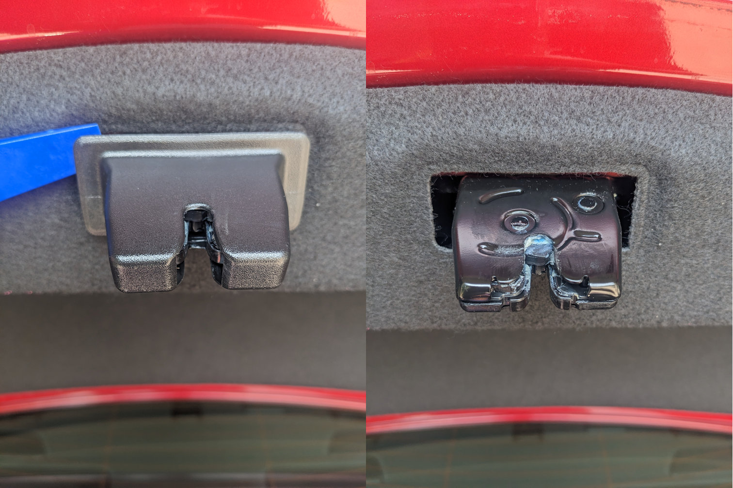 I won’t lie this process can be a bit annoying. There and 9 clips holding the liner on. Its easiest to start with are the two at the front and then work your way back. The clips seem to require pressing the metal pieces from both sides to best unclip them from the trunk, however this isn’t always possible or easily done. Sometimes the clips will unclip while just pulling on the liner a bit, some seem to come off a bit easier if you can at least press one side of the metal piece while pulling. This is one of those things that’s hard to explain, but once you start messing with it you will understand. You will need to pull or pry back liner to get access to the clips. WARNING: These clips are just melted on to the liner and it’s possible for them to break off. I accidentally broke one of mine. However, I used Loctite General Epoxy to re-attach the one clip I broke off and it seemed to work just fine.