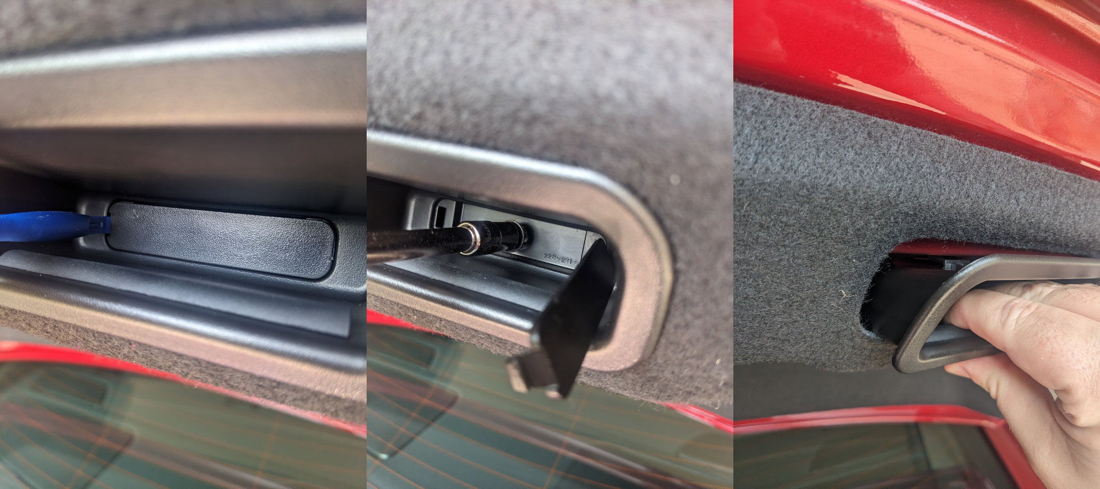 - Re-attach the trunk liner. It’s straight forward, just make sure you tuck under the hinge plastic covering first.