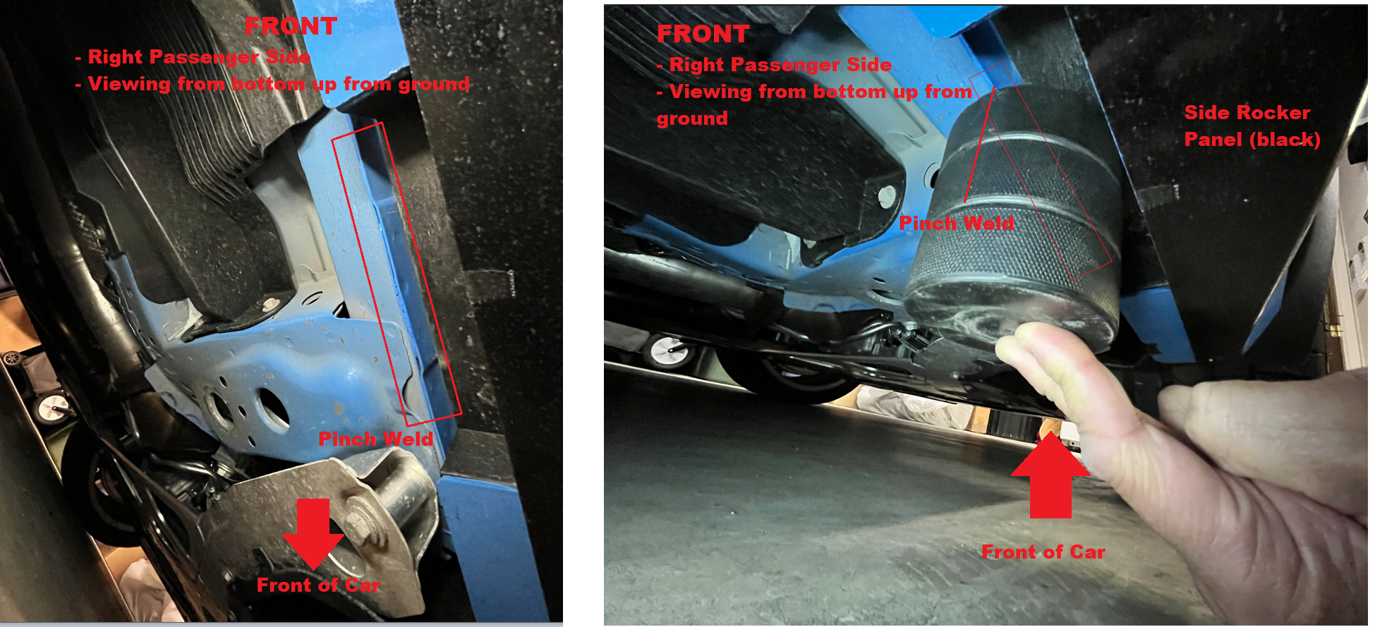 For the FRONT, I used the pinch weld as noted in the instructions: "In the front location, place the lift pads on the rocker outer panel weld flange."