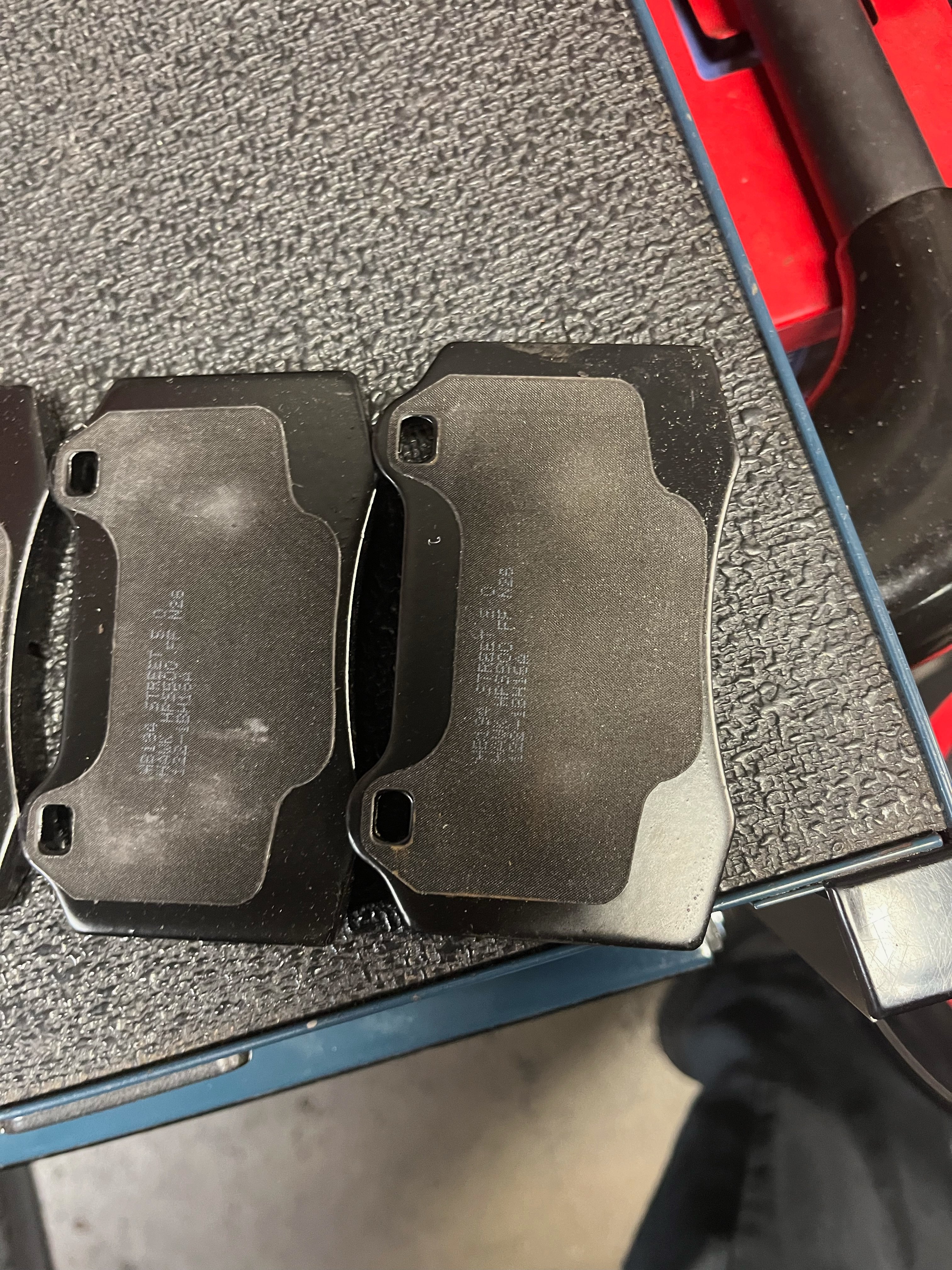 Also, back to the brake issue...., Here are a couple of photos showing the OEM, and KNS brake pad difference without the sensor hole.