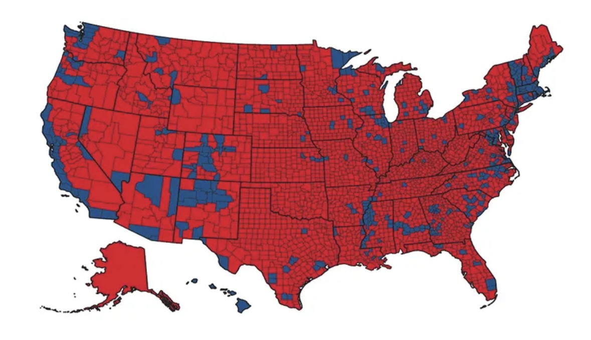 Lots of red but where the blue dots are usually have the highest concentration of college degrees and high paying white color jobs. Even places like TX has blue areas which are most metro areas. Not saying u need an education to succeed in life but most of these blue dots areas probably understand economics better than red areas. Time will tell.
