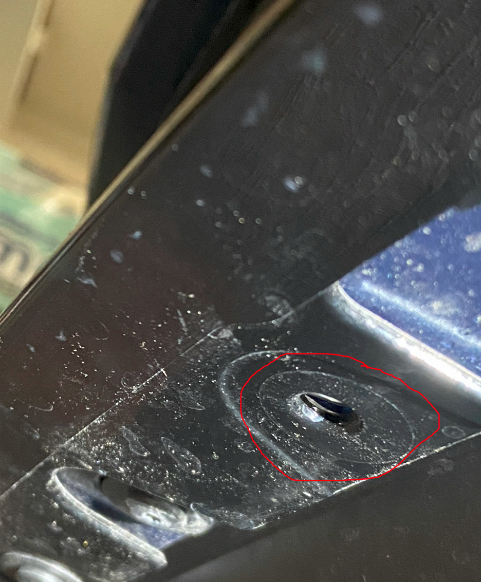 I also found more plastic fasteners that were left off, and some slight damage to the Engine Front Splash Shield. And, strangely, one of the front splitter plastic fasteners is missing - all I can think of is that they harvested it to use elsewhere. From the witness mark, it sure looks like it was installed at the factory.