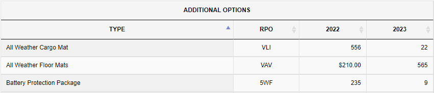 -The additional options table seems to have the all weather mats MSRP in place of the quantity ordered