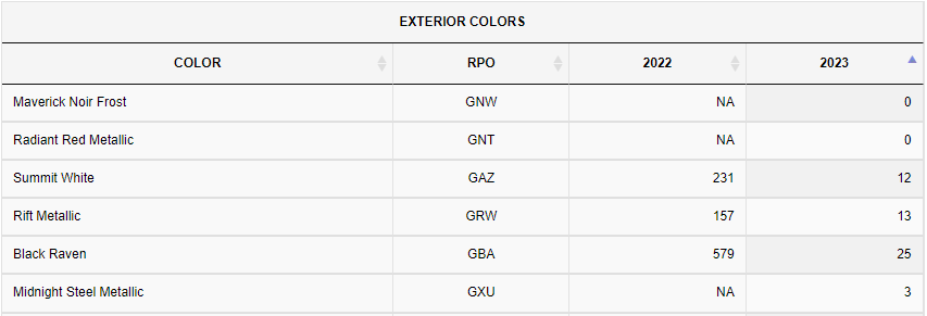 -When sorting the Exterior Color table by model year (especially 2023) it does not seem to sort properly