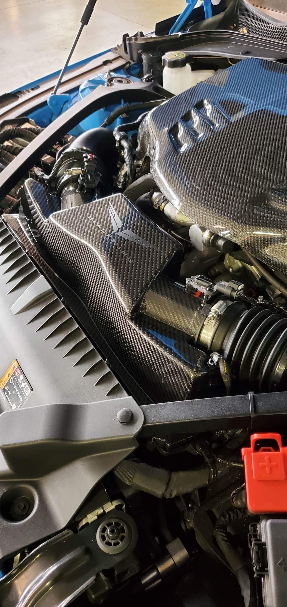 Our new carbon fiber intake system for the CT4-V Blackwing is a work of art. And it also performs! Internally, this revolutionary new airbox design functions in a proprietary manner that increases airflow and boost, without the ECM being aware of the changes. If you bolt this intake to your completely stock CT4-V Blackwing, you will instantly gain 30 to 50 peak whp. Even more impressive is the 70 plus whp gains you’ll have near redline!
