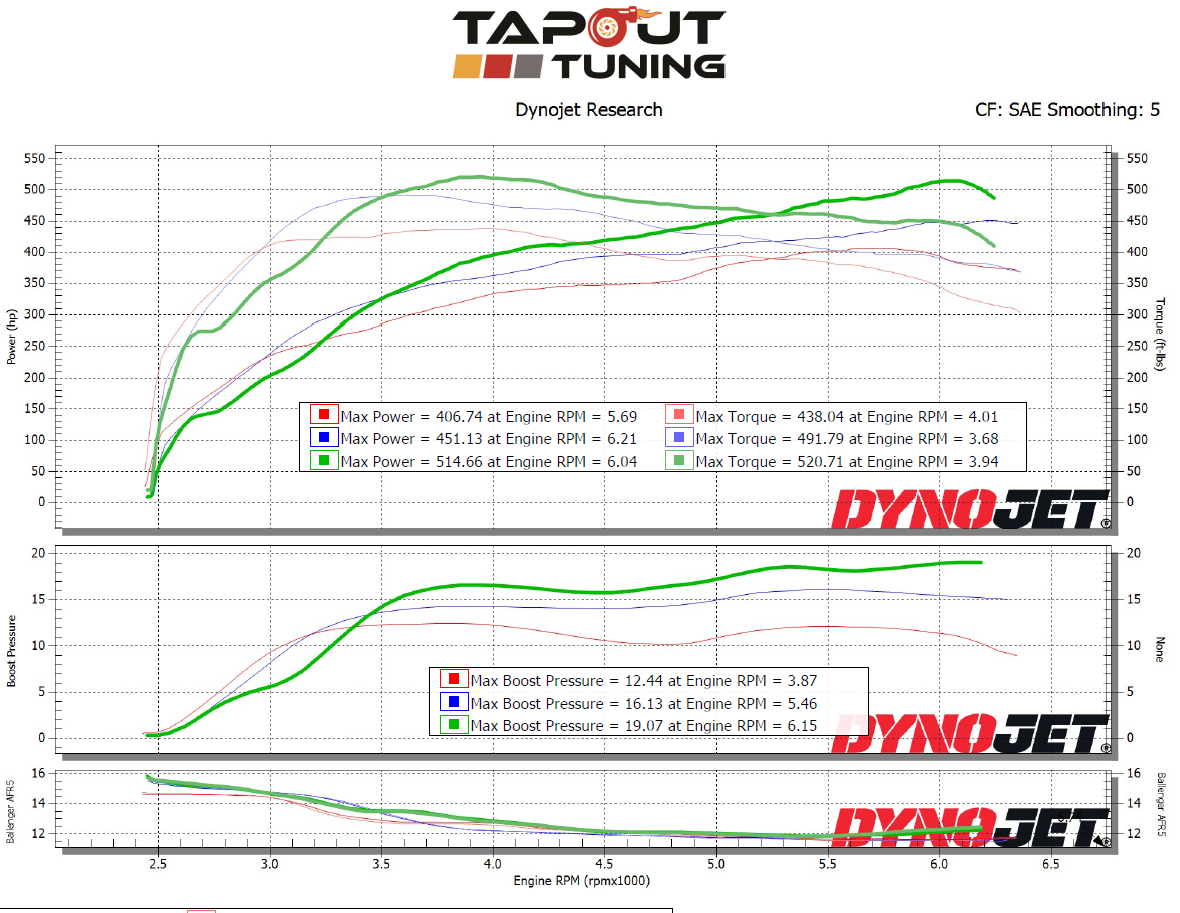 2022 CT4V Blackwing M6 on 93-octane: stock (red lines) versus Tapout intake (blue lines) versus intake with Tapout custom JB4 tune (green lines).