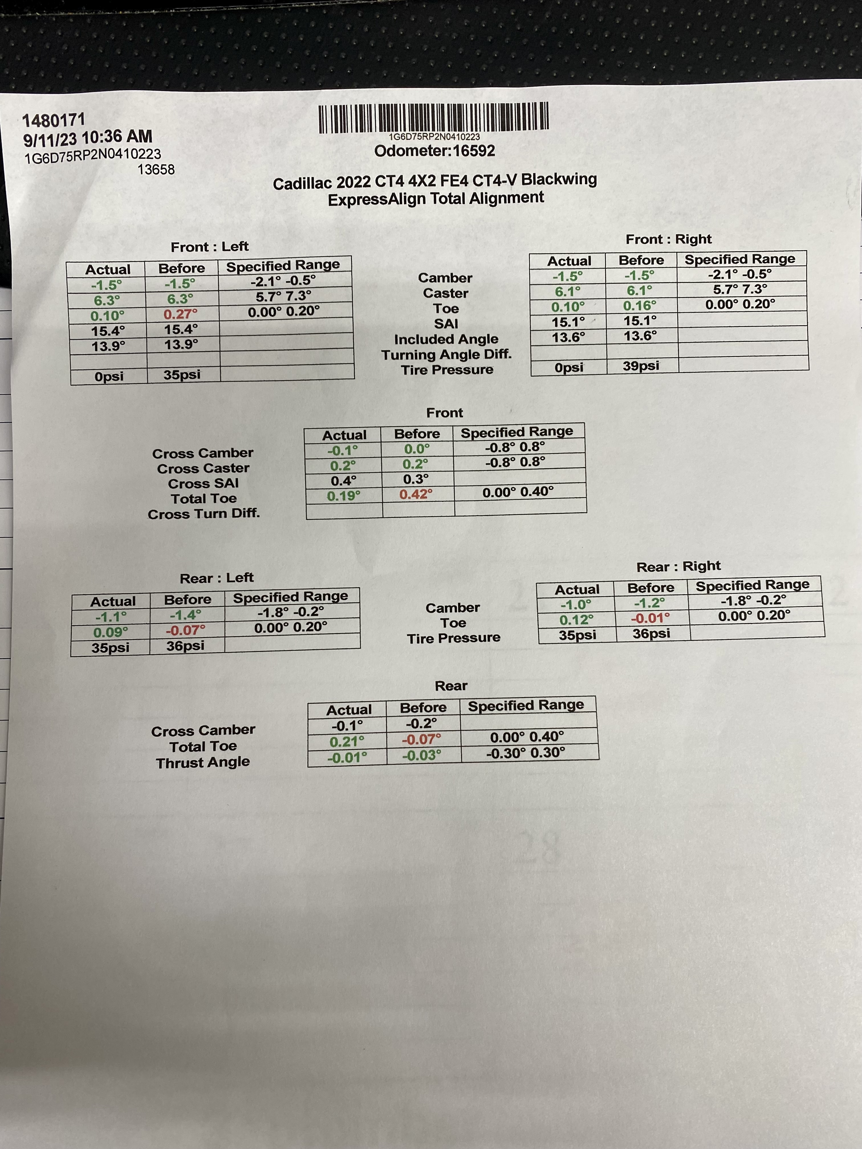 Alignment Configuration - stock for the first 4 track days, then I had a GM Chevy dealer perform the front strut track adjustment per the service manual. They did NOT do a track alignment as I had asked. After another 2 track days, I performed the front suspension bolt adjustment to the suspension to the max. I assume the settings is around -2.5 to -2.7 camber.